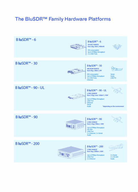 Les radios BluSDR™ assurent une portée étendue, un débit élevé et une robustesse exceptionnelle grâce aux formes d’onde MeshUltra™. Celles-ci fonctionnent en réseau maillé auto-organisé (MANET), résistant et adaptable aux environnements difficiles.